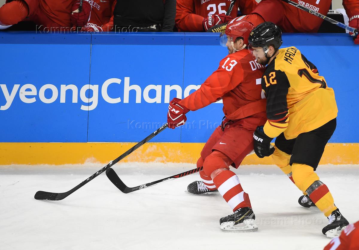 XXIII Winter Olympic Games in PyeongChang. Final hockey match between teams Germany and Olympic athletes from Russia. Russian team player Ilya Kablukov (right) with German national team member Christian Ehrhoff (left) during the match.