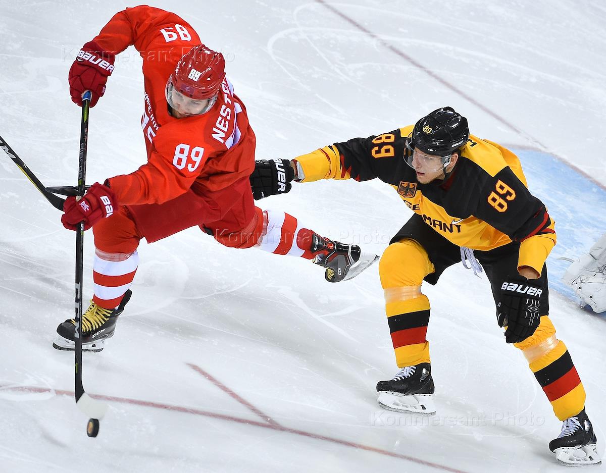 XXIII Зимние Олимпийские игры в Пхенчхане. Хоккей. Мужчины. Финал. Матч между командами России и Германии (4:3) прошел на стадионе Каннын-центр. Российский хоккеист Никита Гусев (слева) и немецкий хоккеист Патрик Раймер (справа) во время матча.