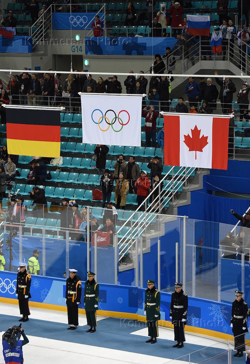 XXIII Зимние Олимпийские игры в Пхенчхане. Финальный матч по хоккею среди мужчин между сборной Германии и командой Олимпийских спортсменов из России (ОСР). Флаги призеров - Германии, белый Олимпийский флаг команды ОСР и Канады - во время церемонии награждения.