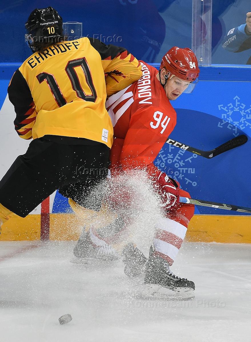 XXIII Зимние Олимпийские игры в Пхенчхане. Финальный матч по хоккею среди мужчин между сборной Германии и командой Олимпийских спортсменов из России (ОСР). Игрок команды ОСР Александр Барабанов (справа) и игрок сборной Германии Кристиан Эрхофф (слева) во время матча.