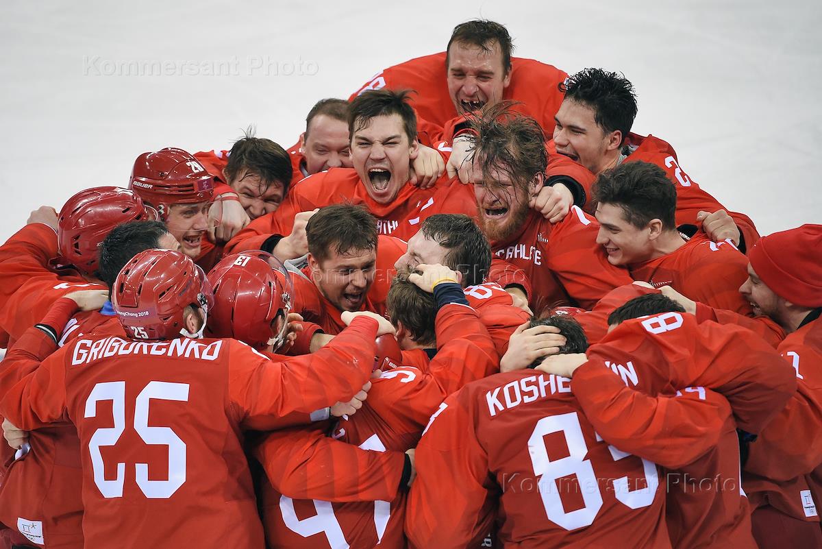XXIII Winter Olympic Games in PyeongChang. Final hockey match between teams Germany and Olympic athletes from Russia. Olympic athletes from Russia's team players after winning the final match.