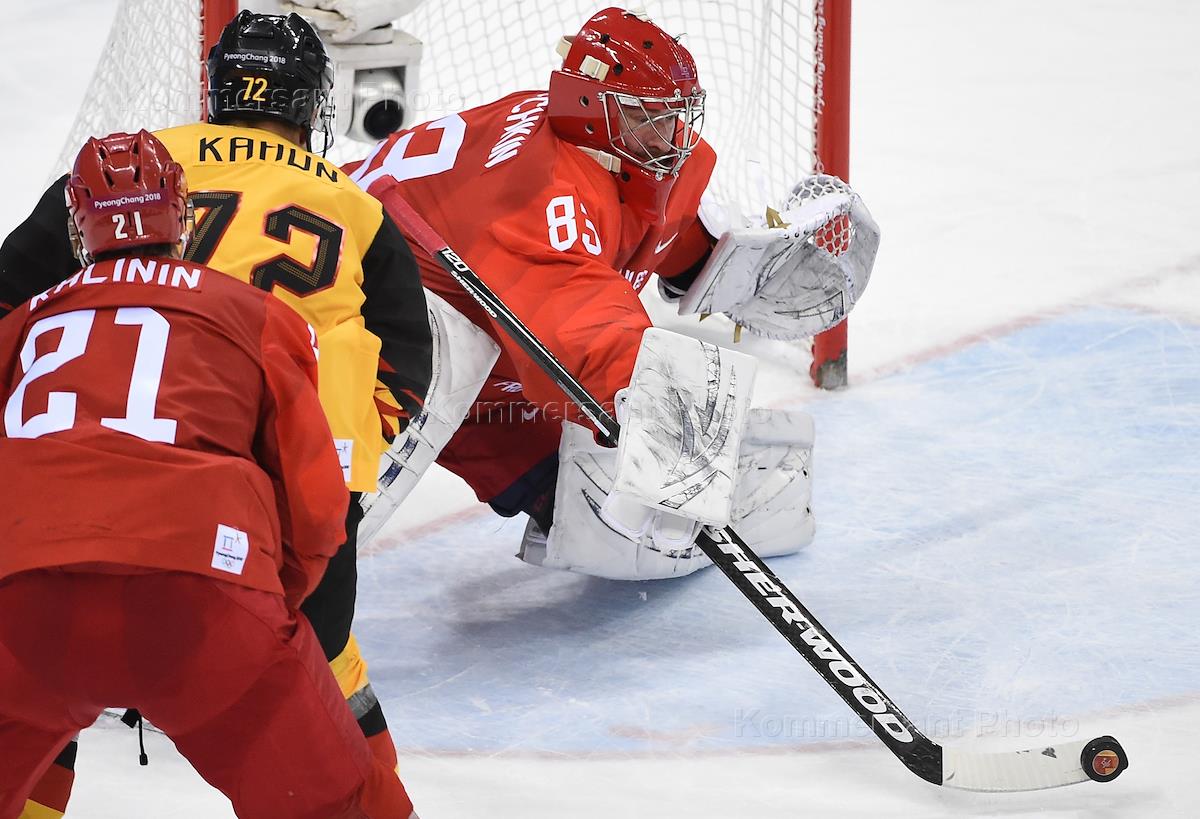 XXIII Winter Olympic Games in PyeongChang. Final hockey match between teams Germany and Olympic athletes from Russia. From left to right: Russian team players goalkeeper Vasili Koshechkin, German national team player Patrick Hager and Russian team player Bogdan Kiselevich during the match.