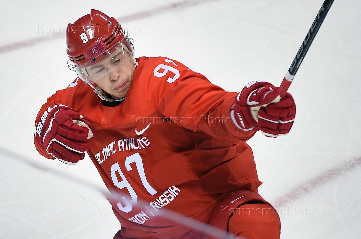 XXIII Winter Olympic Games in PyeongChang. From left to right: Russian team players Nikita Gusev, Kirill Kaprizov and Vyacheslav Voinov during the match.