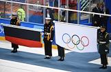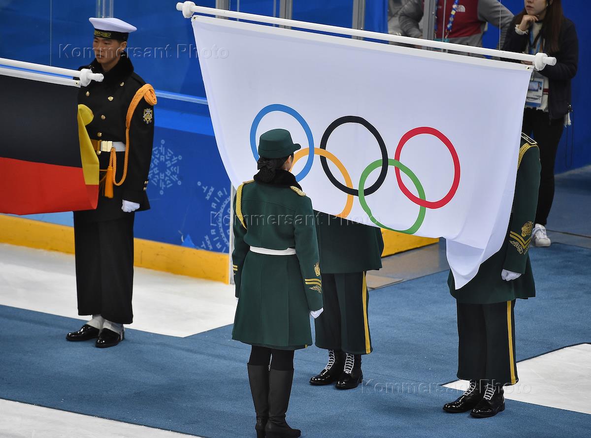XXIII Зимние Олимпийские игры в Пхенчхане. Финальный матч по хоккею среди мужчин между сборной Германии и командой Олимпийских спортсменов из России (ОСР). Белый Олимпийский флаг команды ОСР во время церемонии награждения.