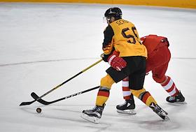 XXIII Зимние Олимпийские игры в Пхенчхане. Финальный матч по хоккею среди мужчин между сборной Германии и командой Олимпийских спортсменов из России (ОСР). Игрок сборной Германи Мориц Мюллер во время матча.