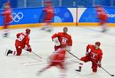 XXIII Зимние Олимпийские игры в Пхенчхане. Финальный матч по хоккею среди мужчин между сборной Германии и командой Олимпийских спортсменов из России (ОСР). Игроки команды ОСР во время матча.