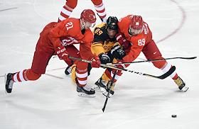 XXIII Зимние Олимпийские игры в Пхенчхане. Финальный матч по хоккею среди мужчин между сборной Германии и командой Олимпийских спортсменов из России (ОСР). Слева направо: вратарь сборной Германии Дэнни аус ден Биркен, игрок команды ОСР Никита Гусев и игрок сборной Германии Доминик Кагун во время матча.