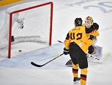 XXIII Зимние Олимпийские игры в Пхенчхане. Финальный матч по хоккею среди мужчин между сборной Германии и командой Олимпийских спортсменов из России (ОСР). Игрок команды ОСР Кирилл Капризов (слева) и вратарь сборной Германии Дэнни аус ден Биркен (справа) во время матча.
