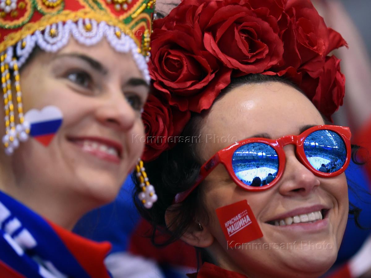 XXIII Зимние Олимпийские игры в Пхенчхане. Финальный матч по хоккею среди мужчин между сборной Германии и командой Олимпийских спортсменов из России (ОСР). Болельщицы из России во время матча.