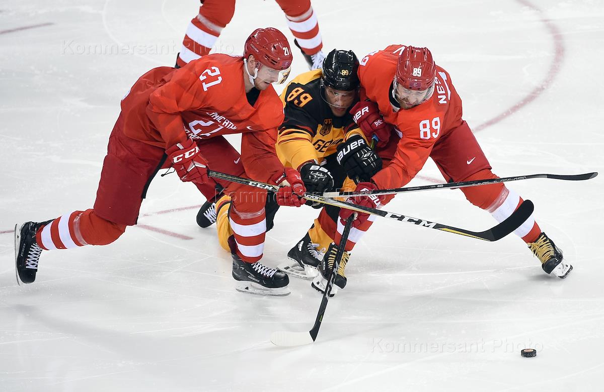 XXIII Зимние Олимпийские игры в Пхенчхане. Финальный матч по хоккею среди мужчин между сборной Германии и командой Олимпийских спортсменов из России (ОСР). Игрок команды ОСР Сергей Андронов (в центре), игроки сборной Германии Феликс Шюц (слева) и Бьёрн Крупп (справа) во время матча.
