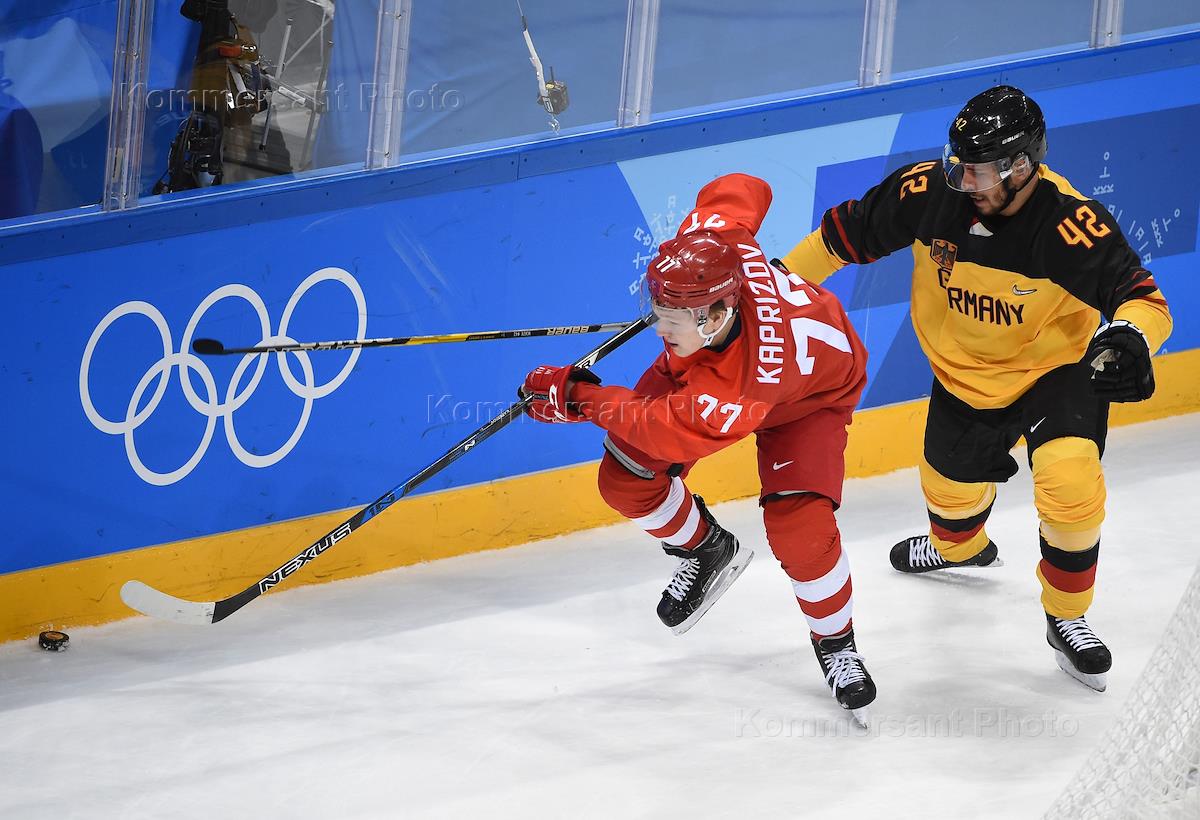 XXIII Зимние Олимпийские игры в Пхенчхане. Финальный матч по хоккею среди мужчин между сборной Германии и командой Олимпийских спортсменов из России (ОСР). Игрок команды ОСР Кирилл Капризов (слева) и игрок сборной Германии Ясин Эхлиз (справа) во время матча.