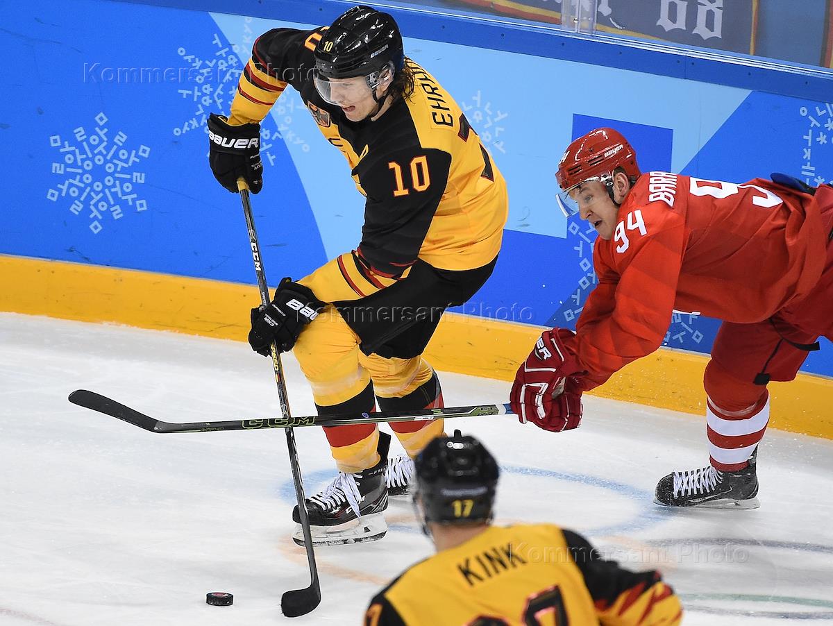 XXIII Зимние Олимпийские игры в Пхенчхане. Финальный матч по хоккею среди мужчин между сборной Германии и командой Олимпийских спортсменов из России (ОСР). Игрок команды ОСР Артем Зуб (в центре) и игрок сборной Германии Феликс Шюц (справа) во время матча.