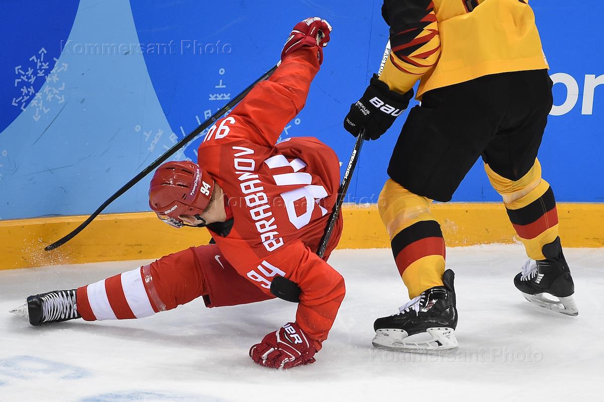 XXIII Winter Olympic Games in PyeongChang. Final hockey match between teams Germany and Olympic athletes from Russia. Russian team player Alexander Barabanov (left) with German national team member Marcel Goc (right) during the match.