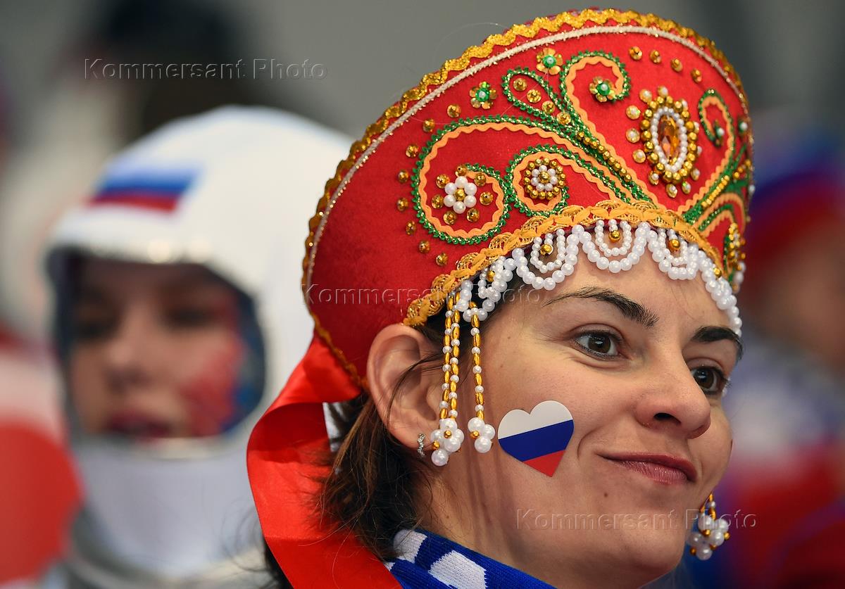 XXIII Зимние Олимпийские игры в Пхенчхане. Финальный матч по хоккею среди мужчин между сборной Германии и командой Олимпийских спортсменов из России (ОСР). Болельщица из России в кокошнике на зрительской трибуне во время матча.
