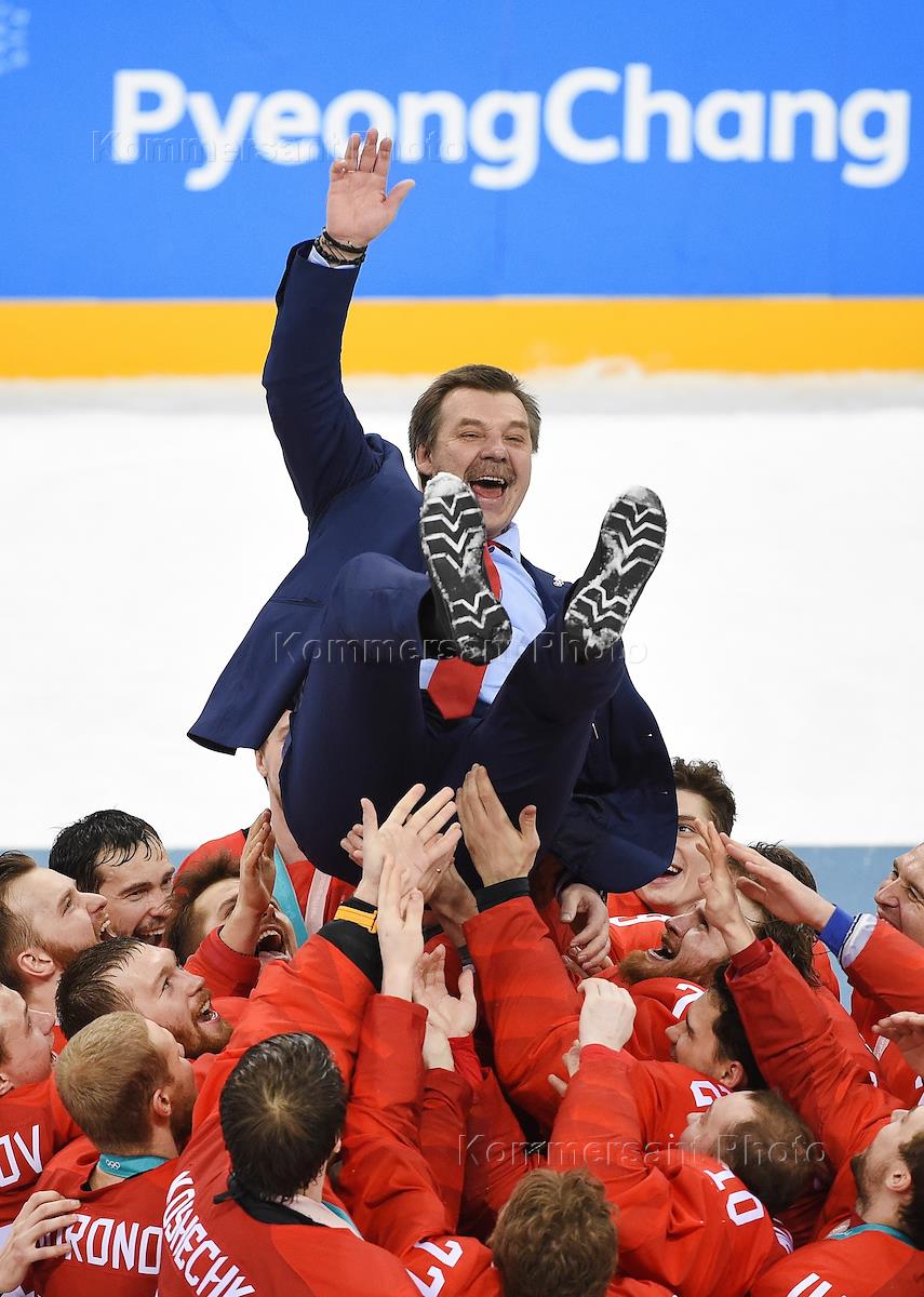 XXIII Зимние Олимпийские игры в Пхенчхане. Хоккей. Мужчины. Финал. Матч между командами России и Германии (4:3) прошел на стадионе Каннын-центр. Российские хоккеисты и главный тренер сборной России по хоккею Олег Знарок после церемонии награждения.