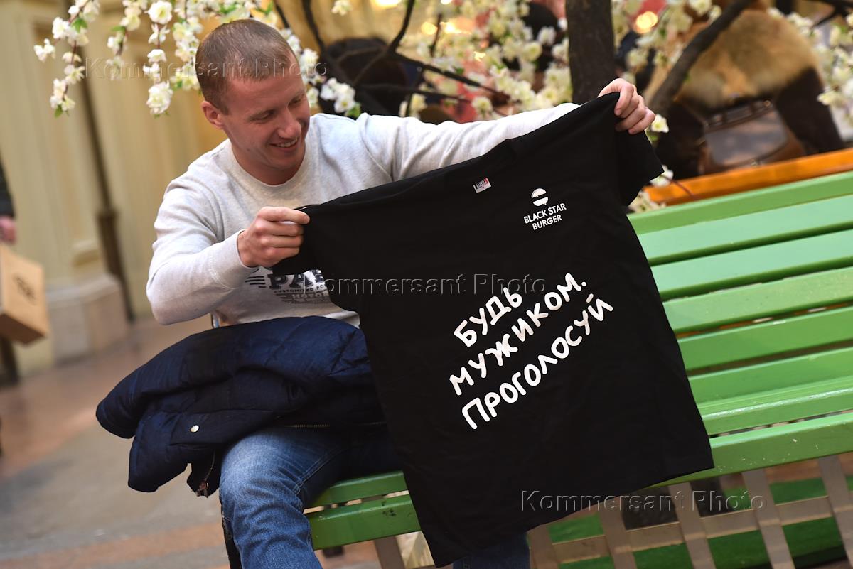 Жанровая фотография. Мужчина держит футболку с надписью "Будь мужиком. Проголосуй".