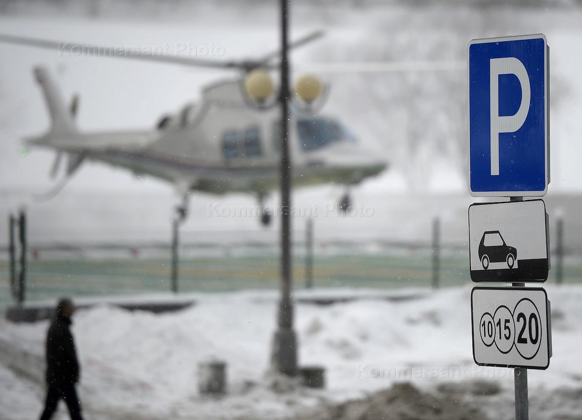 Вертолет генерального директора Государственной корпорации по содействию разработке, производству и экспорту высокотехнологичной промышленной продукции "Ростех" Сергея Чемезова в небе над Московским международным бизнес-центром "Москва-Сити". Жанровая фотография. Дорожный знак "Платная парковка автомобилей".