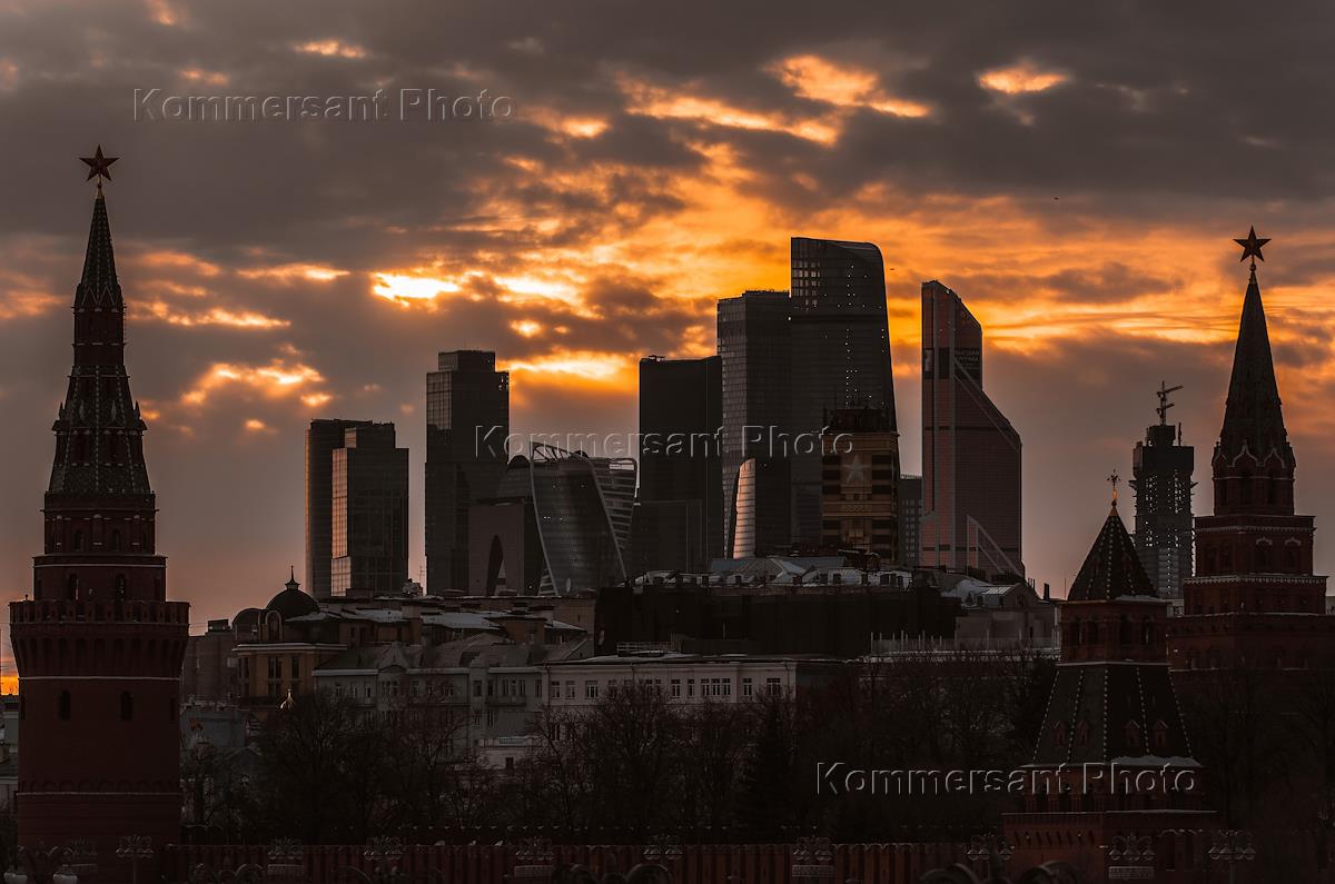 Жанровая фотография. Силуэт делового комплекса "Москва-Сити" на закате.