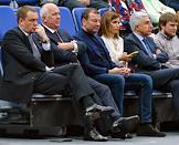 Чемпионат Евролиги сезона 2017/2018 по баскетболу. Матч между командами ЦСКА (Россия, Москва) и "Баскония" (Испания, Витория). Слева направо: президент и генеральный директор ПБК ЦСКА Андрей Ватутин, генеральный директор Государственной корпорации "Ростех" Сергей Чемезов и президент Единой лиги ВТБ Сергей Кущенко во время матча.