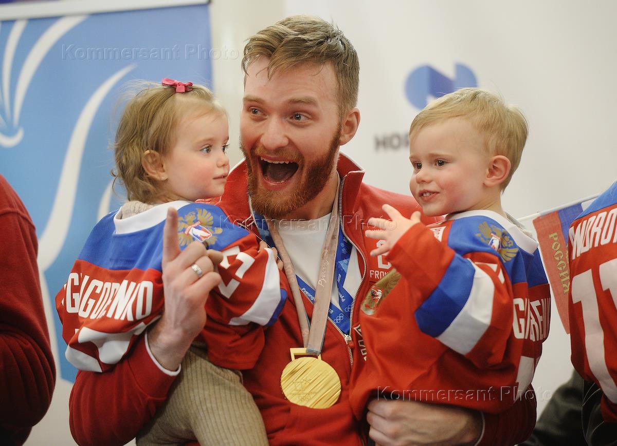 Торжественная встреча участников XXIII Олимпийских зимних игр в Пхенчхане прошла в аэропорту "Шереметьево". Хоккеист Михаил Григоренко с детьми во время встречи.
