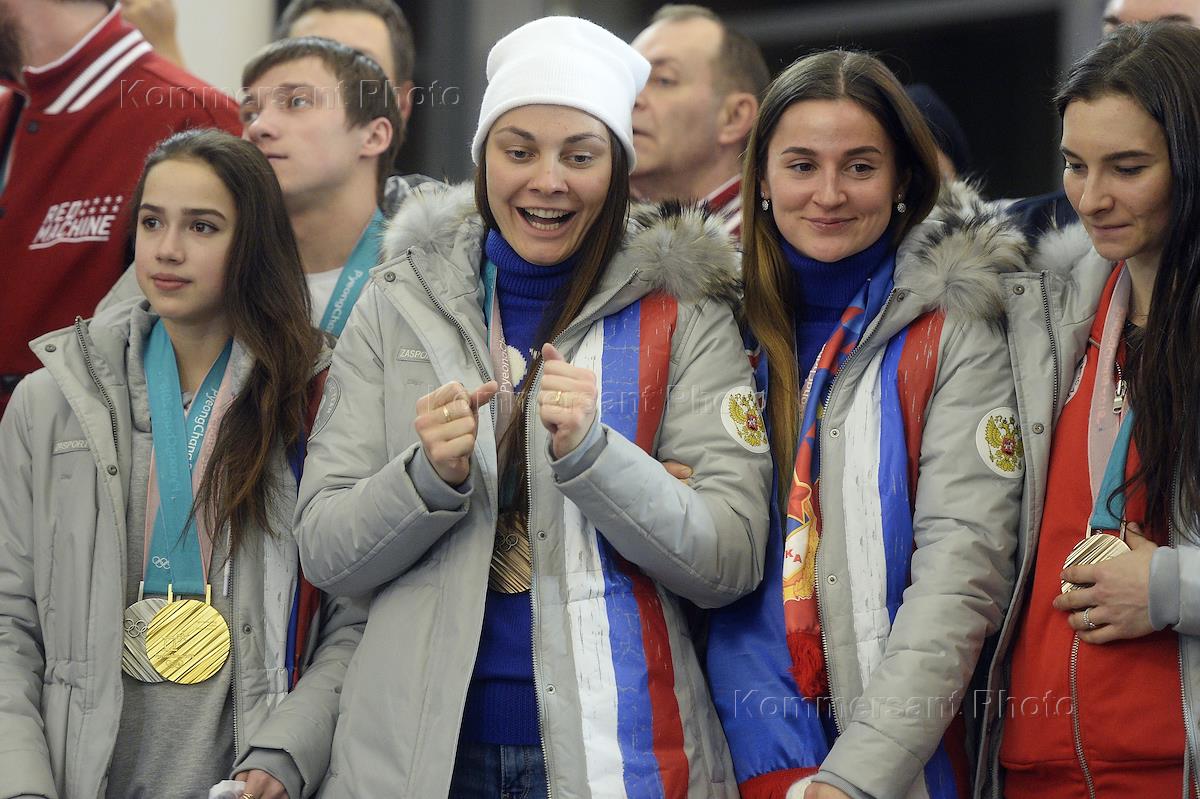 Торжественная встреча участников XXIII Олимпийских зимних игр в Пхенчхане прошла в аэропорту "Шереметьево". Фигуристка Екатерина Боброва (в центре) во время встречи.