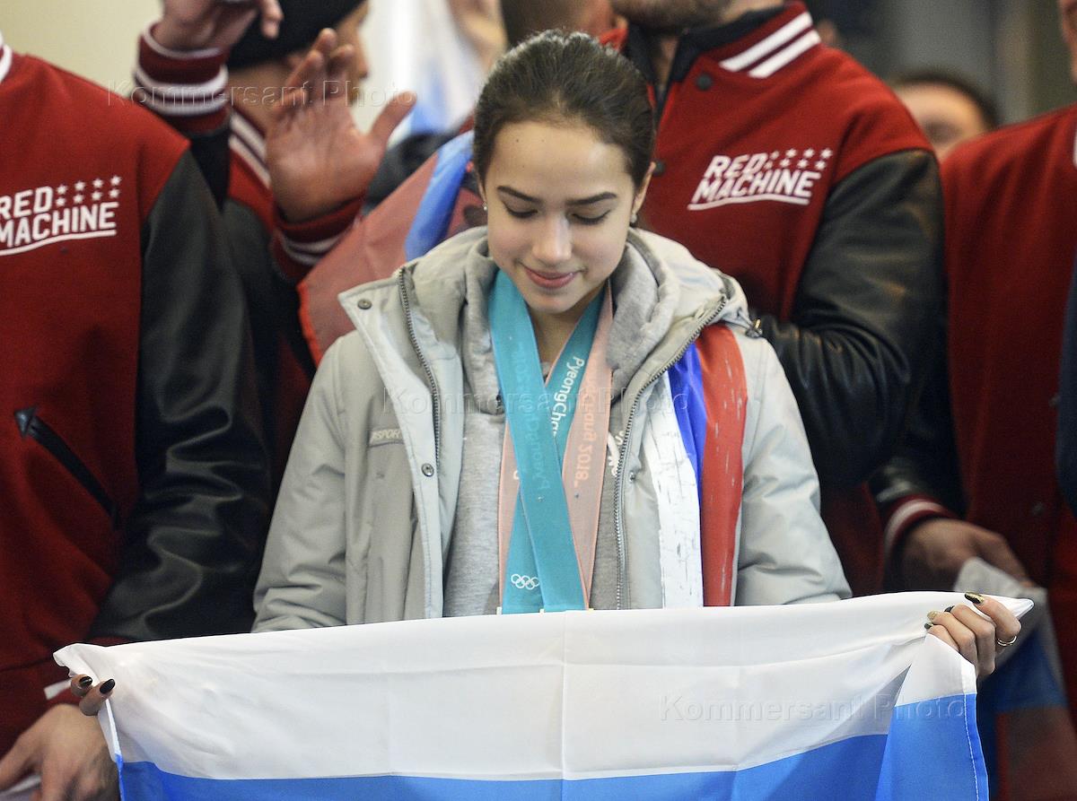 Торжественная встреча участников XXIII Олимпийских зимних игр в Пхенчхане прошла в аэропорту "Шереметьево". Фигуристка Алина Загитова во время встречи.