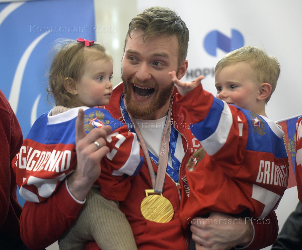 Торжественная встреча участников XXIII Олимпийских зимних игр в Пхенчхане прошла в аэропорту "Шереметьево". Хоккеист Михаил Григоренко с детьми во время встречи.