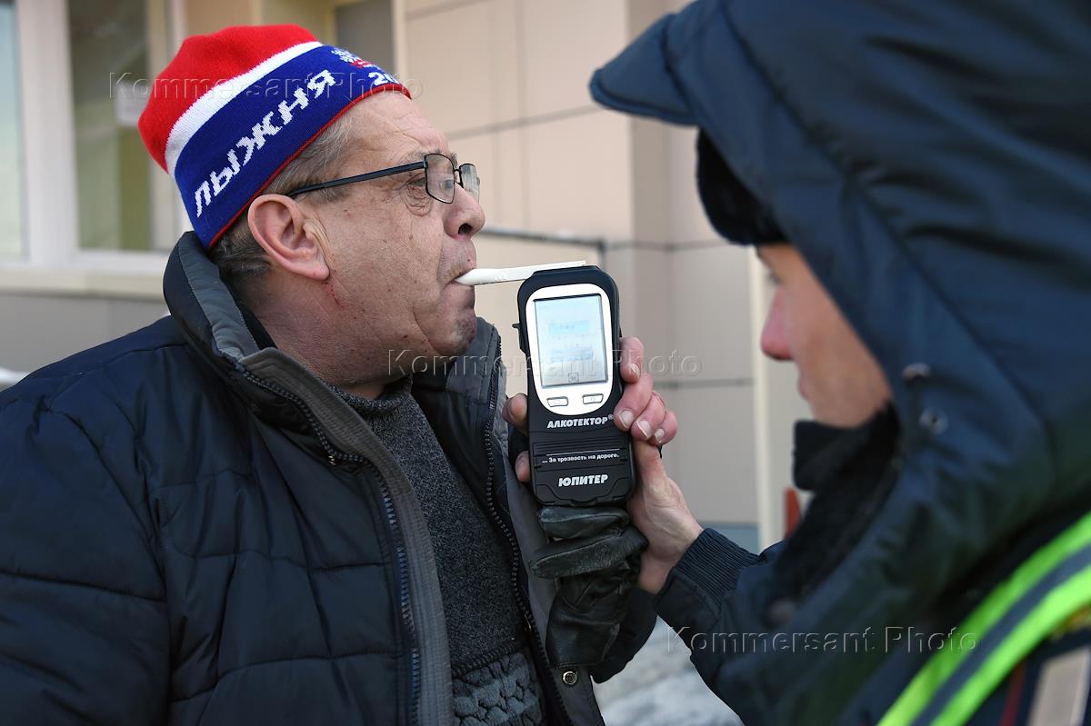 Рейд ГИБДД Москвы по выявлению нетрезвых водителей. Сотрудник ДПС во время проверки водителя с помощью алкотестера.