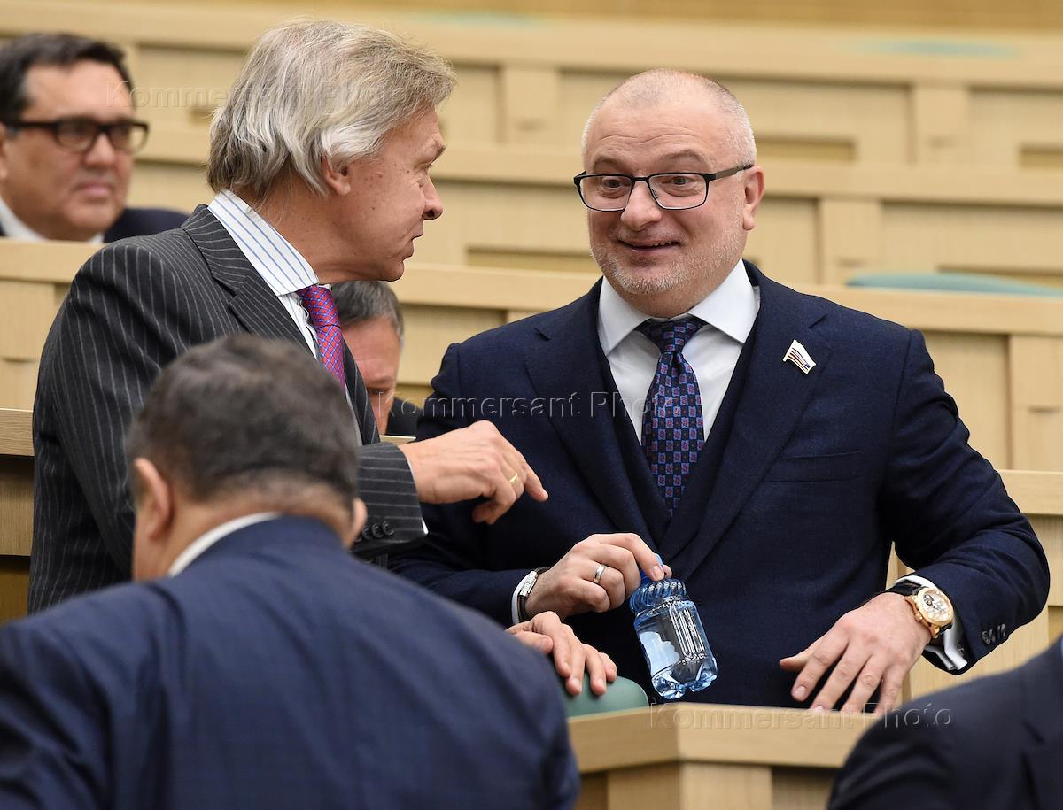 Пленарное заседание Совета Федерации (СФ) России. Представитель от законодательного (представительного) органа государственной власти Пермского края Алексей Пушков (слева) и председатель комитета Совета Федерации России по конституционному законодательству, правовым и судебным вопросам, развитию гражданского общества Андрей Клишас (справа) перед началом заседания.