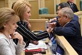 Пленарное заседание Совета Федерации (СФ) России. Представитель в Совете Федерации от исполнительного органа государственной власти Липецкой области Ираида Тихонова (в центре) перед началом заседания.