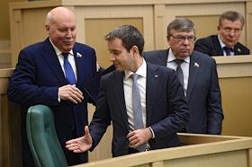 Пленарное заседание Совета Федерации (СФ) России. Слева направо: представитель в СФ России от исполнительного органа государственной власти Сахалинской области Дмитрий Мезенцев, министр связи и массовых коммуникаций России Николай Никифоров и представитель в СФ России от законодательной власти Курской области Валерий Рязанский во время заседания.
