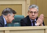 Пленарное заседание Совета Федерации (СФ) России. Почетный президент Олимпийского комитета России, представитель в Совете Федерации России от законодательного органа Ростовской области Леонид Тягачев (справа) перед началом заседания.
