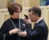 Заседание Совета Федерации (СФ) России. Представитель в СФ России от исполнительного органа государственной власти Приморского края Светлана Горячева (слева) и представитель в СФ России от исполнительного органа государственной власти Пермского края Андрей Климов во время заседания.