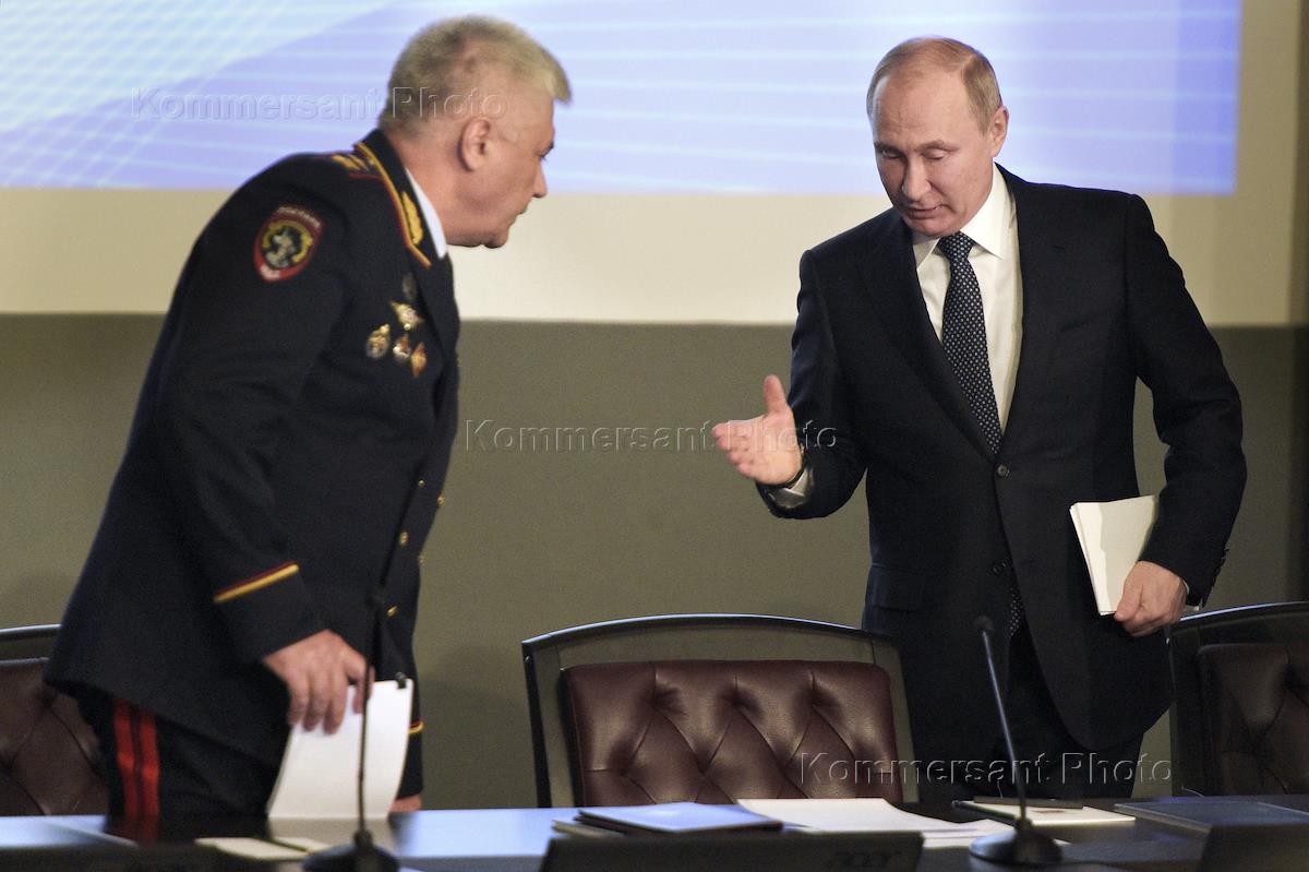 Расширенное заседание коллегии Министерства внутренних дел (МВД) России. Министр МВД России Владимир Колокольцев (слева) и президент России Владимир Путин (справа) во время заседания.