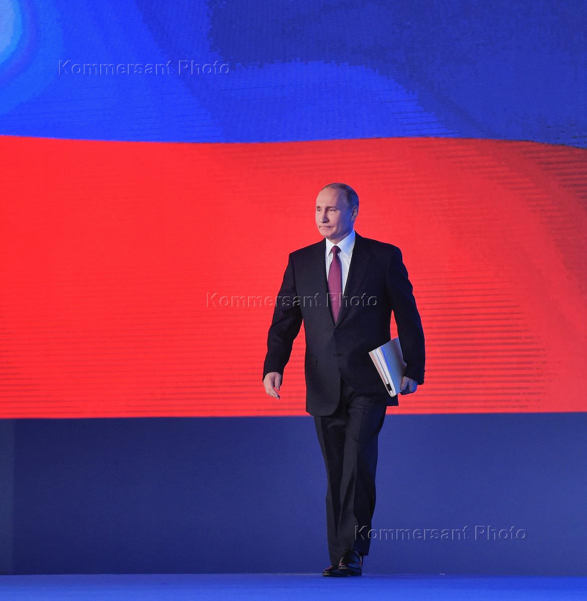Ежегодное Послание президента России Владимира Путина Федеральному Собранию прошло в Центральном выставочном зале (ЦВЗ) "Манеж". Президент России Владимир Путин во время оглашения Послания.