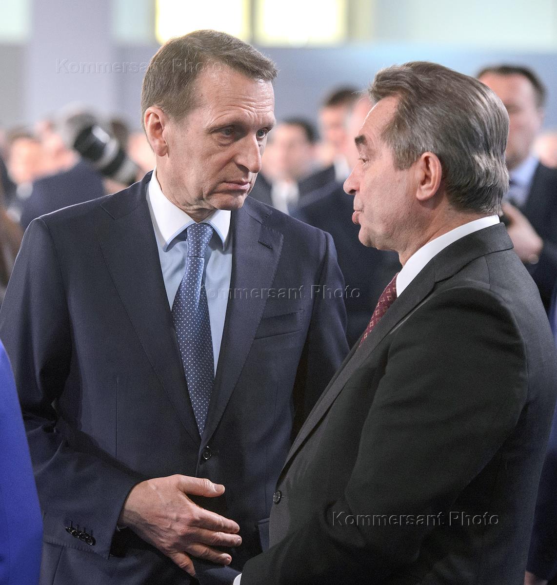 Ежегодное Послание президента России Владимира Путина Федеральному Собранию прошло в Центральном выставочном зале (ЦВЗ) "Манеж". Директор Службы внешней разведки Сергей Нарышкин (слева) перед оглашением Послания.