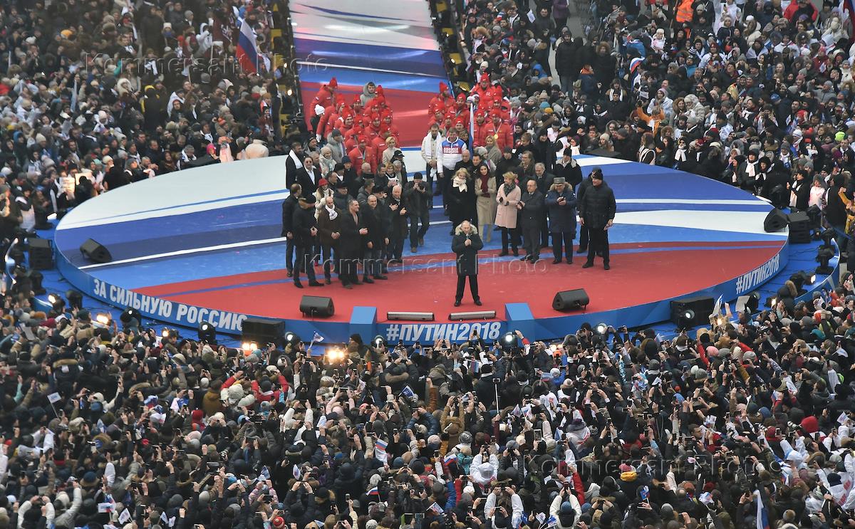 Митинг-концерт "За сильную Россию!" в поддержку кандидата в президенты России Владимира Путина прошел на стадионе "Лужники". Кандидат в президенты России действующий президент Владимир Путин во время митинга.