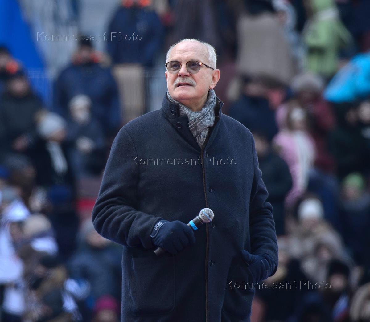 Митинг-концерт "За сильную Россию!" в поддержку кандидата в президенты России Владимира Путина прошел на стадионе "Лужники". Председатель Союза кинематографистов России, кинорежиссер Никита Михалков во время митинга.