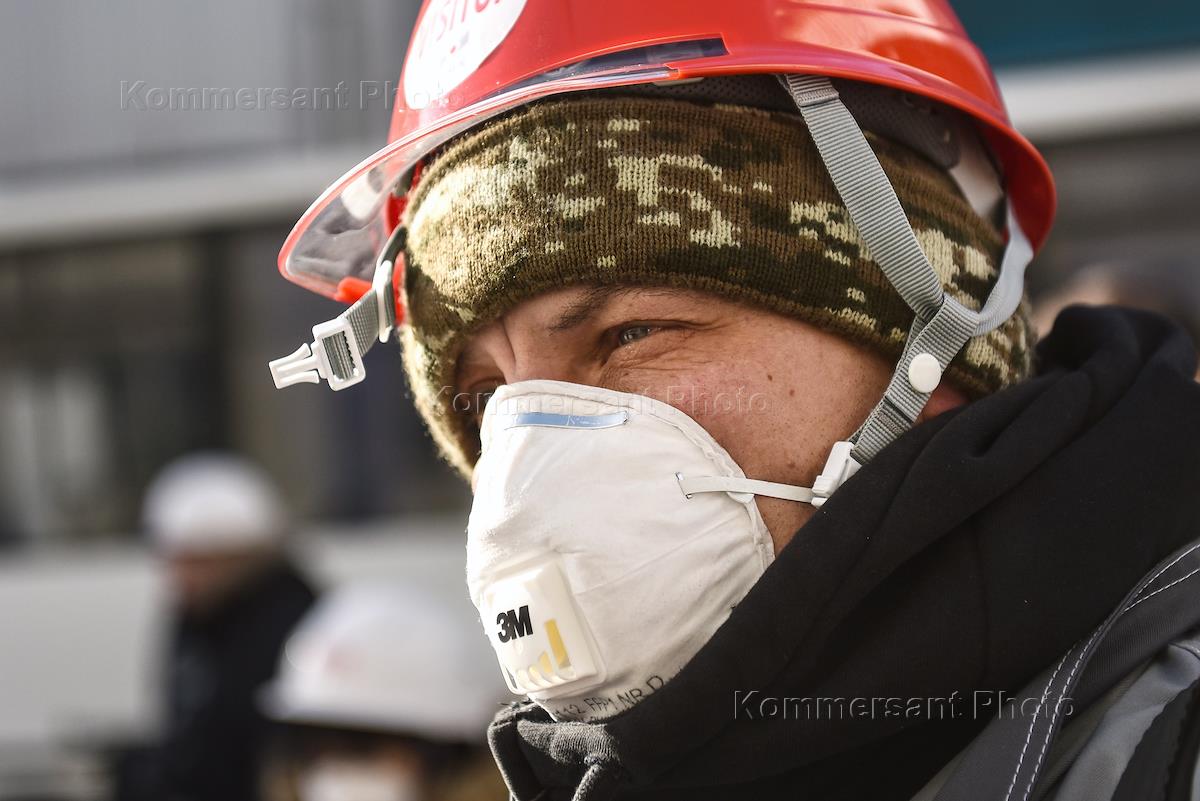 Территория Выксунского металлургического завода. Жанровая фотография. Плакат с надписью "Носи Каску!".
