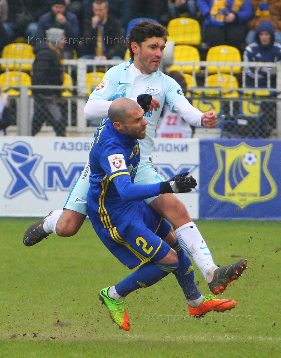 Чемпионат России по футболу. Премьер-лига. Матч между командами "Зенит" (Санкт-Петербург) и "Ростов" (Ростов-на-Дону) прошел на стадионе Олимп-2. Игрок команды "Зенит" Далер Кузяев (справа) и игрок команды "Ростов" Александр Сапета (слева) во время матча.