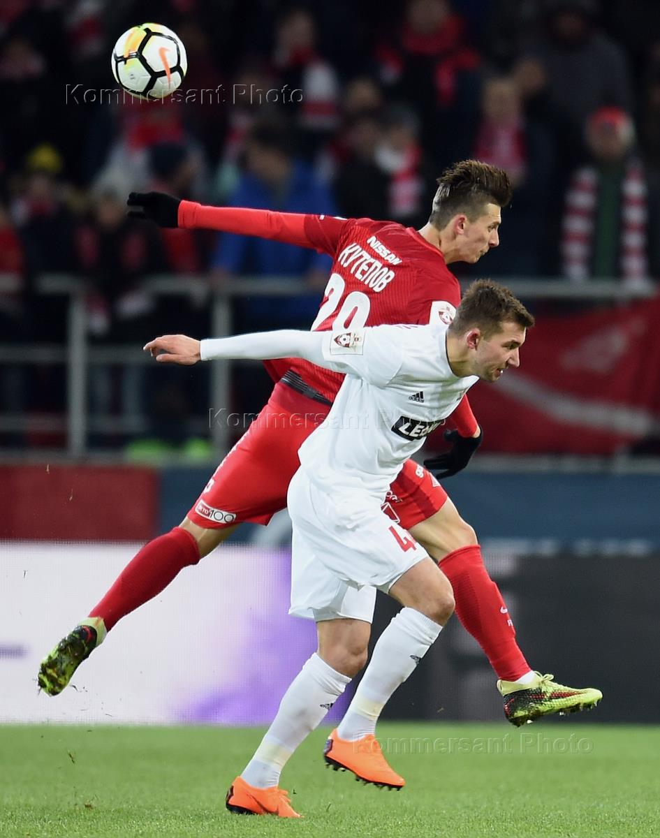 РОСГОССТРАХ Чемпионат России по футболу 2017/2018. 22-й тур. Матч между командами "Спартак" (Москва) и "СКА-Хабаровск" (Хабаровск) прошел на стадионе "Открытие Арена". Игрок команды "Спартак" Илья Кутепов (слева) и игрок команды "СКА-Хабаровск" Неманья Тубич (справа) во время матча.