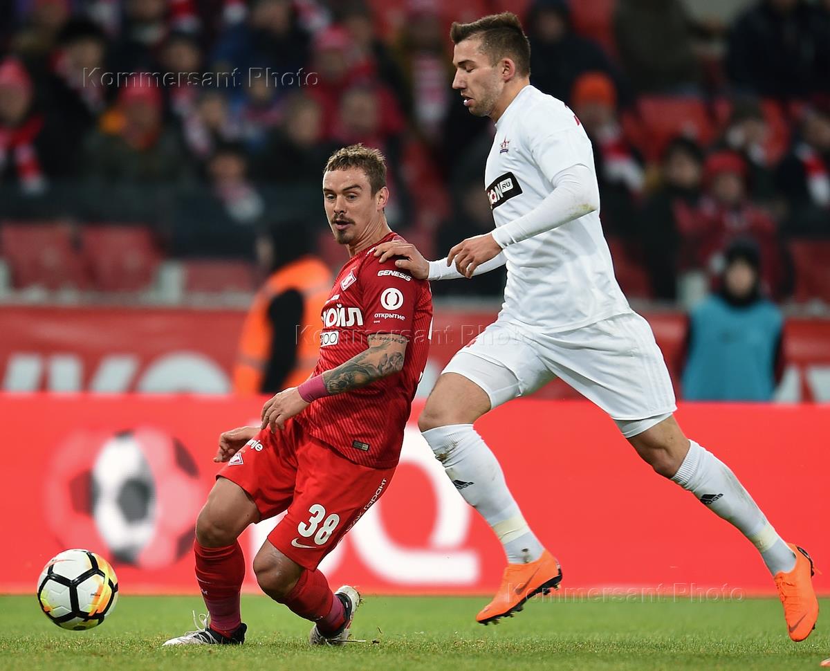 РОСГОССТРАХ Чемпионат России по футболу 2017/2018. 22-й тур. Матч между командами "Спартак" (Москва) и "СКА-Хабаровск" (Хабаровск) прошел на стадионе "Открытие Арена". Игрок команды "Спартак" Денис Глушаков (слева) во время матча.