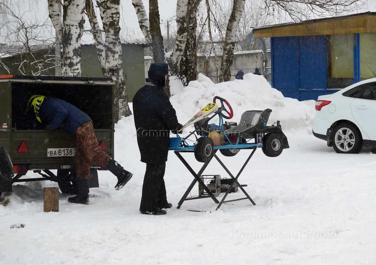 Соревнования по картингу на территории спортивного комплекса "Мотодром". Участники ремонтируют карты после гонки.