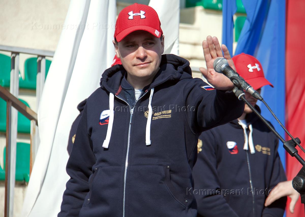 Всероссийская межнациональная зарядка "180318: Мы выбираем сильную страну" прошла на стадионе "Труд" имени Елены Исинбаевой. Глава Федерального агентства по делам национальностей России Игорь Баринов во время акции.