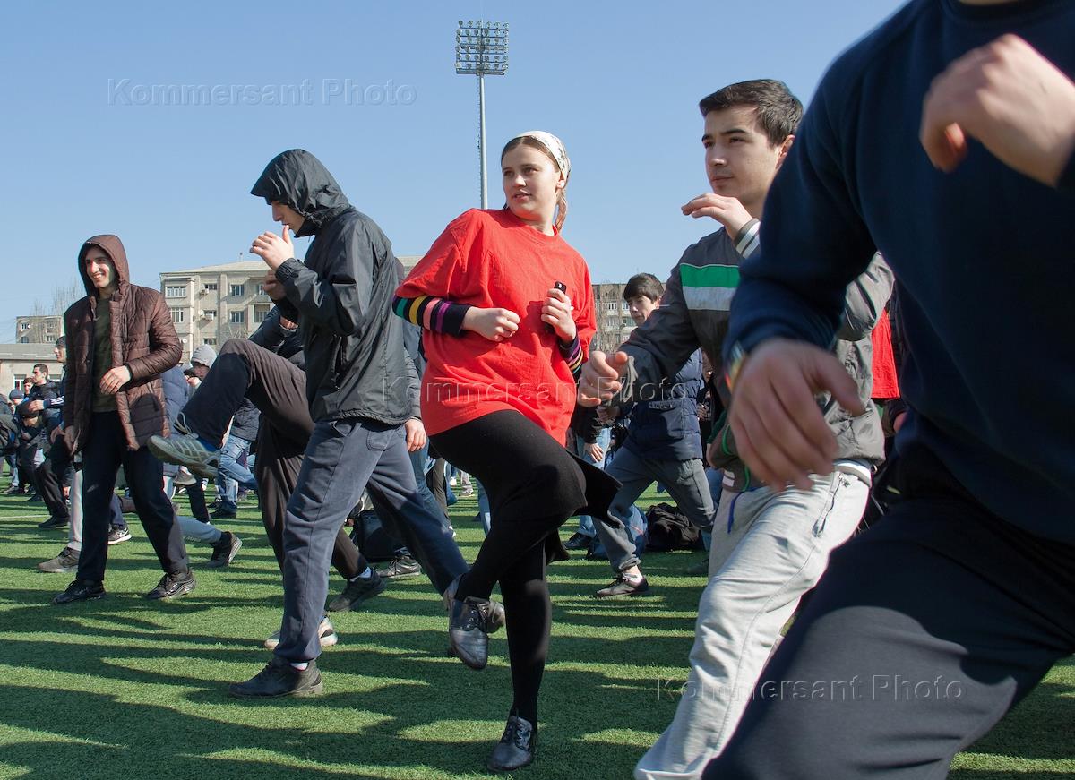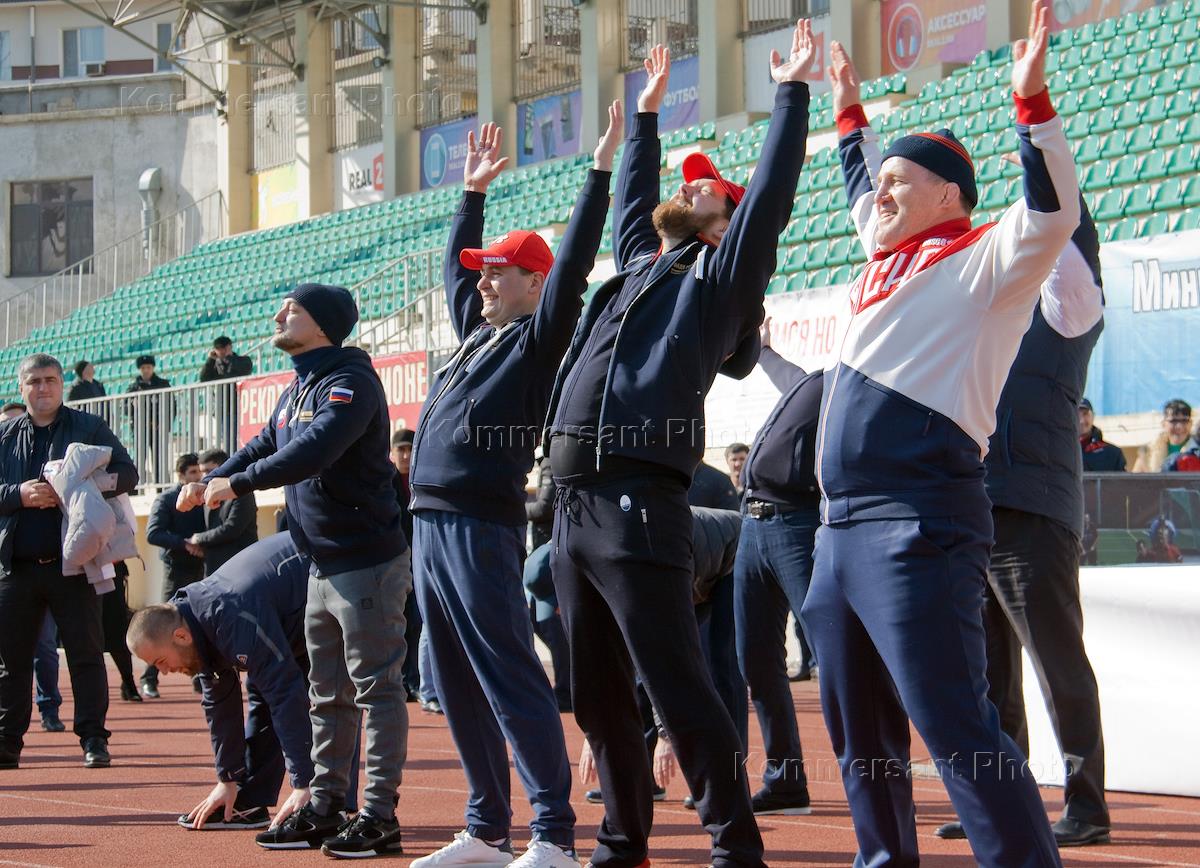 Всероссийская межнациональная зарядка "180318: Мы выбираем сильную страну" прошла на стадионе "Труд" имени Елены Исинбаевой. Председатель правительства Дагестана Артем Здунов во время акции.