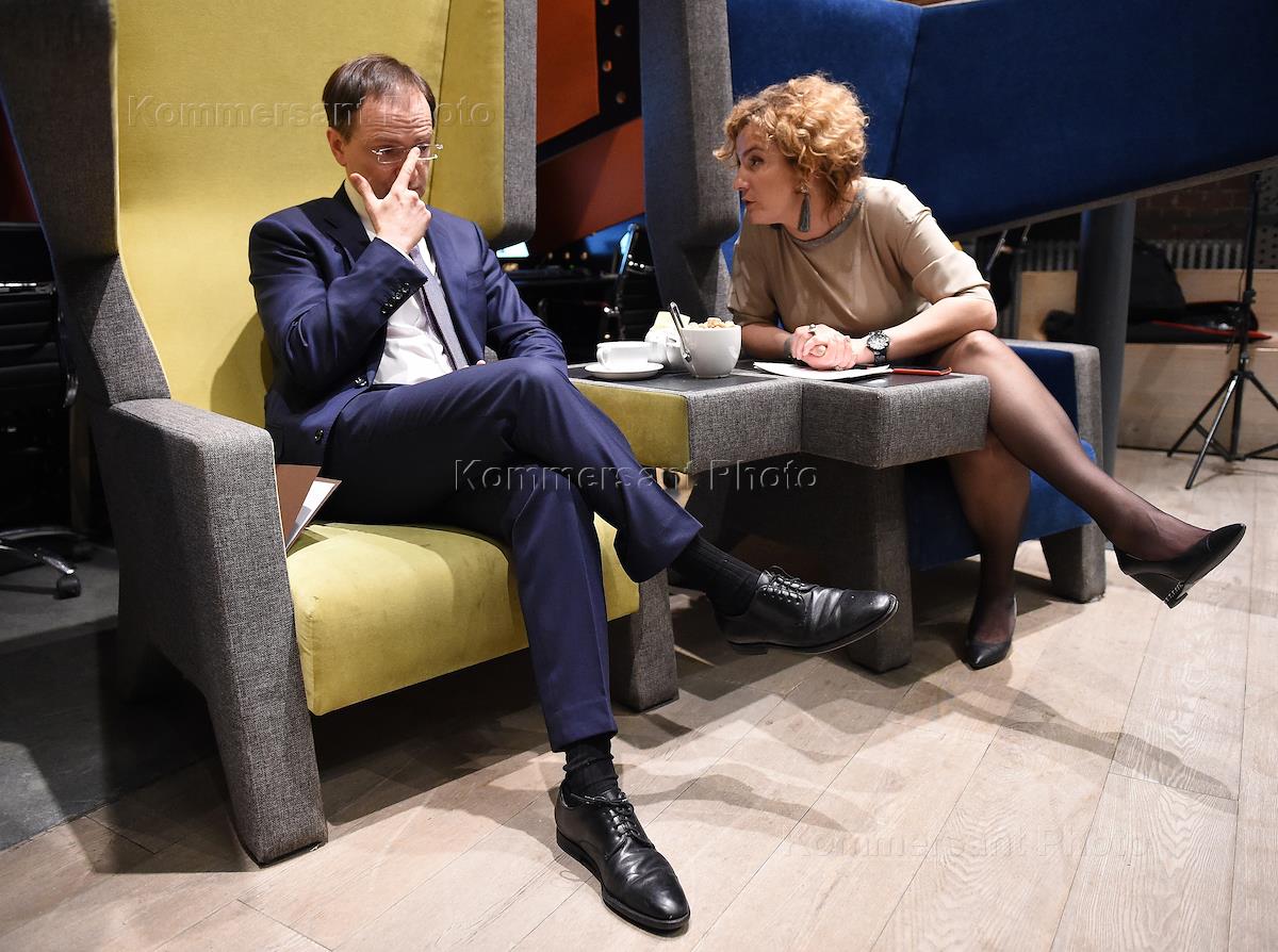 Презентация новых проектов киностудии "Союзмультфильм" прошла в Центре документального кино. Министр культуры России Владимир Мединский (слева) и председатель правления киностудии "Союзмультфильм" Юлиана Слащева (справа) во время презентации.