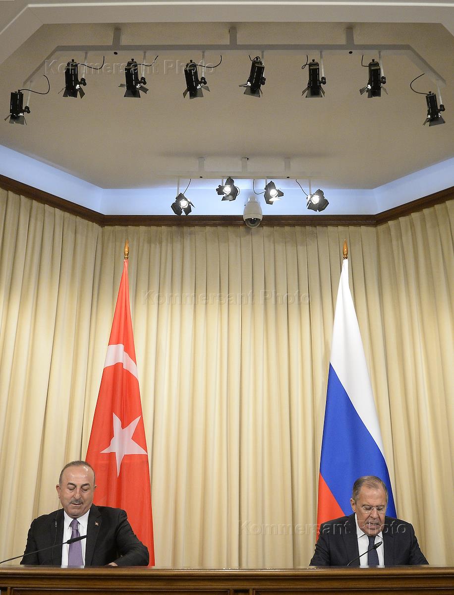 Министр иностранных дел Турции Мевлют Чавушоглу (слева) и министр иностранных дел России Сергей Лавров (справа) во время встречи в Доме приемов МИД России.