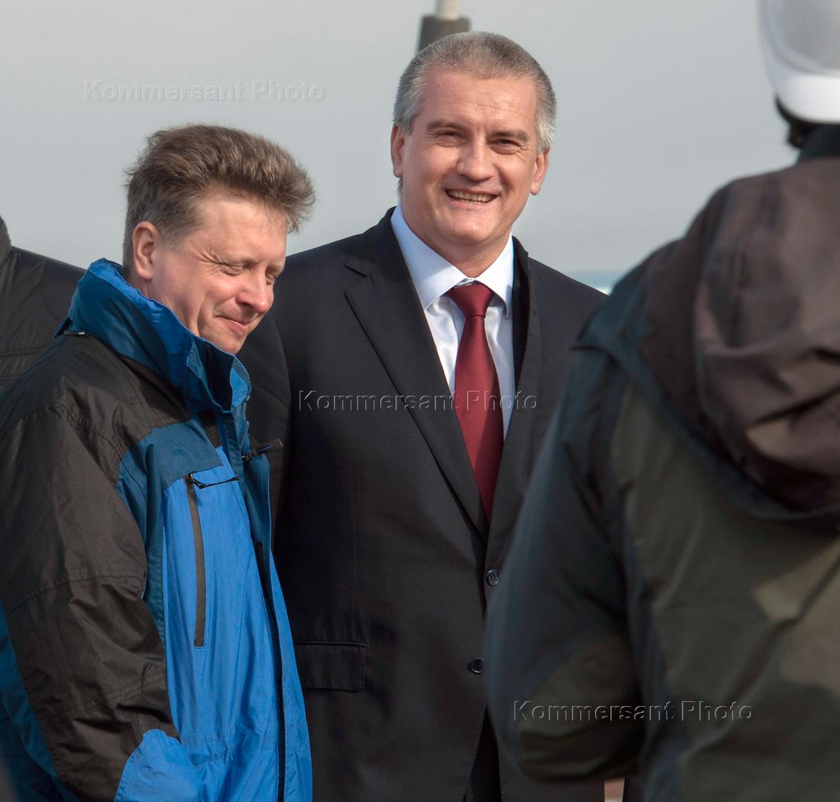 Russian President Vladimir Putin work trip to the Republic of Crimea. Russian Transport Minister Maxim Sokolov (left) and head of the Republic of Crimea Sergei Aksenov (right) inspecting the finished section of Crimean bridge highway.
