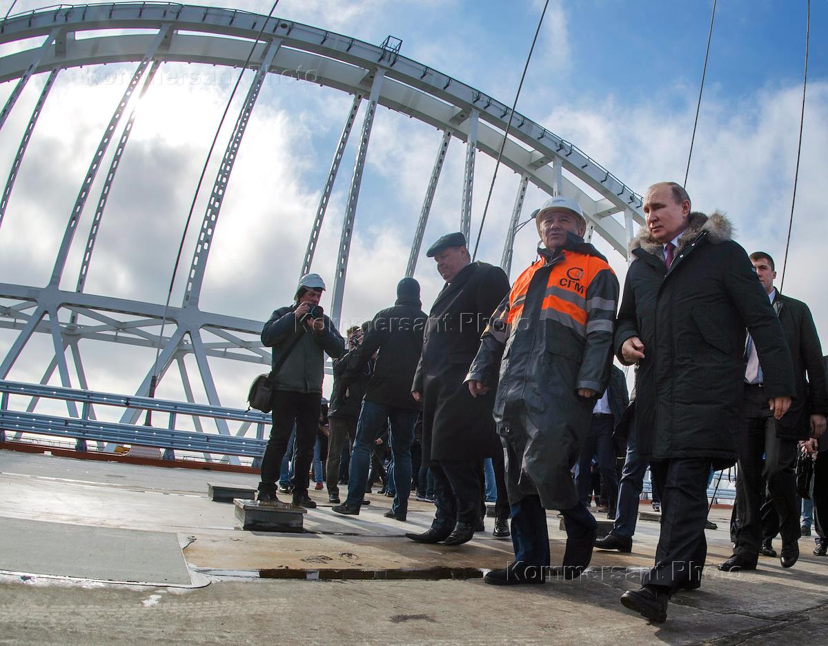 Russian President Vladimir Putin work trip to the Republic of Crimea. Russian President Vladimir Putin (center) inspecting the finished section of Crimean bridge highway.