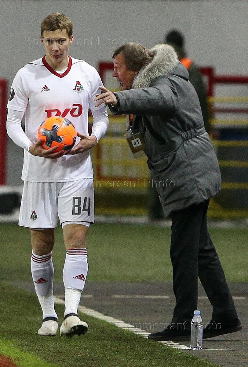 Лига Европы УЕФА по футболу. 1/8 финала. Ответный матч между командами "Локомотив" (Россия, Москва) и "Атлетико" (Испания, Мадрид) прошел на стадионе "РЖД Арена". Игрок команды "Локомотив" Михаил Лысов (слева) и главный тренер команды "Локомотив" Юрий Семин (справа) во время матча.
